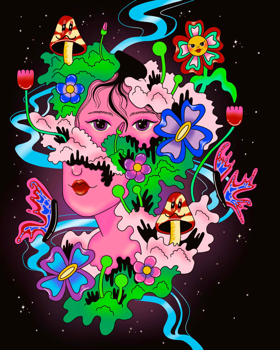 Wasteland is her visual interpretation of surrender in the midst of chaos. Surrounded by surreal flora, melting skies, and wandering creatures, the central figure appears both consumed and at peace, blending into the disorder rather than resisting it. Through vibrant colors and distorted harmony, she explores what it means to let go and coexist with the wild uncertainty of the world.